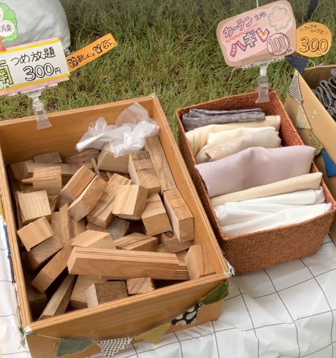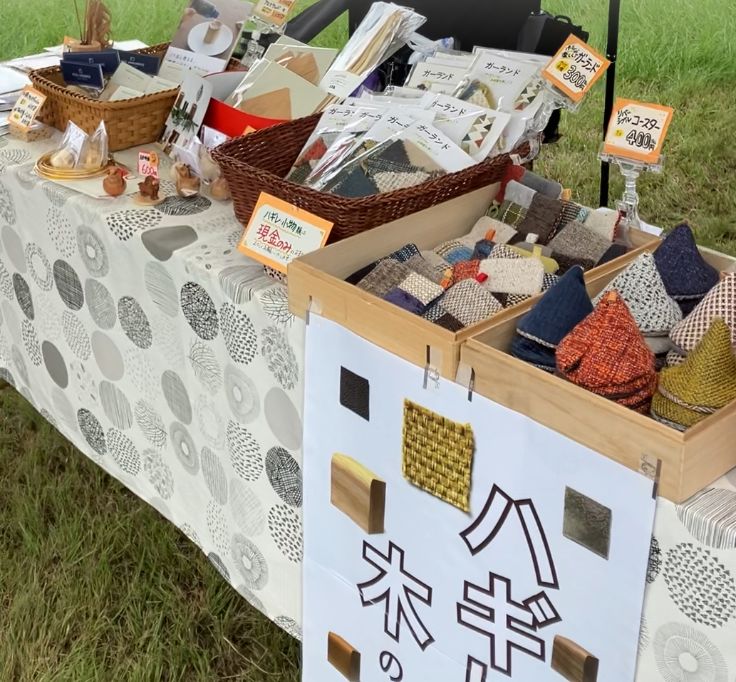 ソファ地のハギレで作った「ミニ鍋つかみ」や「コースター」、アロマグッズやミニギャッベなどを並べ、朝からたくさんの方々にお立ち寄りいただき、ありがとうございます♪